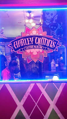 Here's what some of the inside looked like. You can see what some of the other tattoo designs looked like on the wall. Of course I went with the Joker and Harley Quinn. There was also a giant Harley Quinn decal on the floor (in the same design as the tattoo art) that I forgot to take a picture of, but hopefully you can imagine that that looks like based on my temporary tattoo.